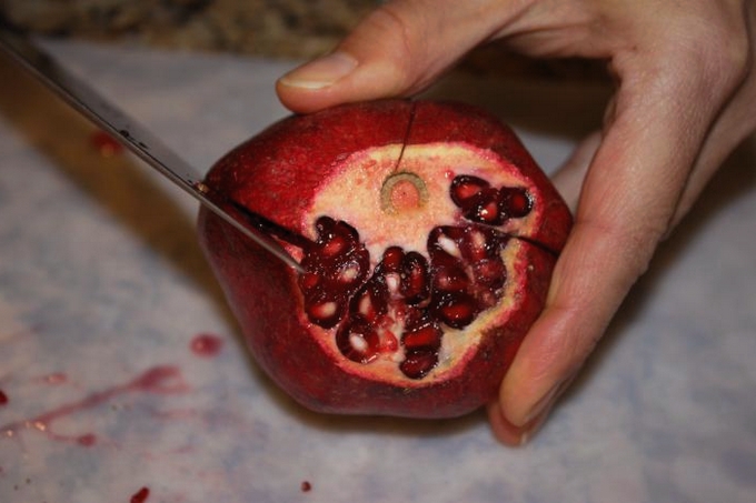 - We wassen en snijden de granaatappel. We scheiden de nucleoli ervan.