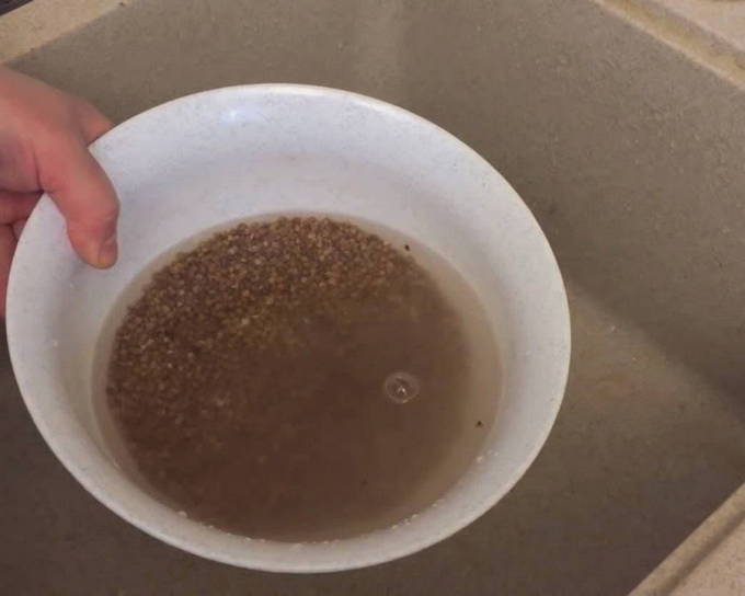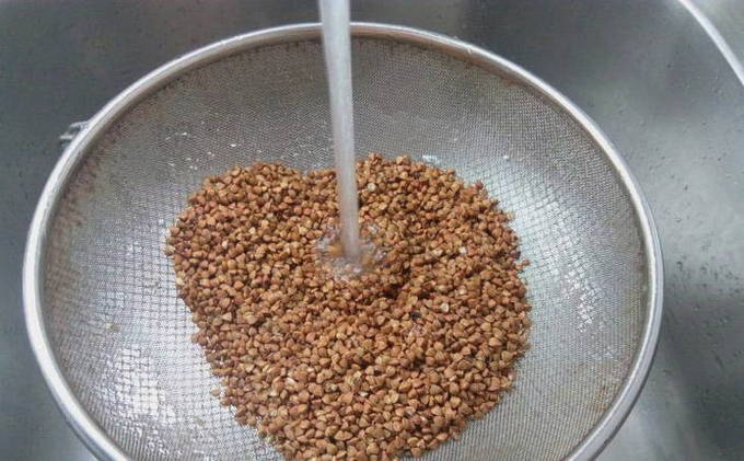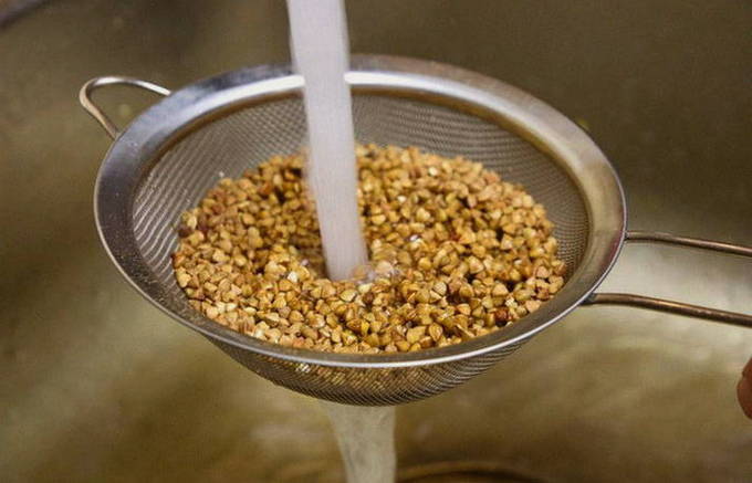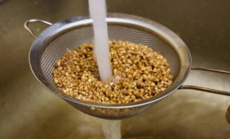 - Vervolgens moet de boekweit onder stromend water worden afgespoeld. Het is handig om dit met een fijne zeef te doen.