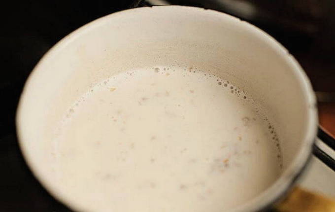 - Giet vervolgens melk in de pan. Voeg zout en suiker toe. Laat de inhoud koken, zet het vuur uit en sta erop dat het gerecht 5 minuten wordt afgedekt.