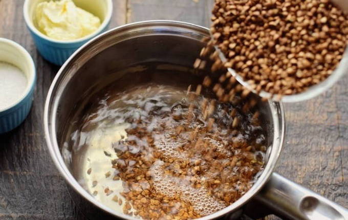 Hoe kruimelige boekweitpap in water in een pan koken?