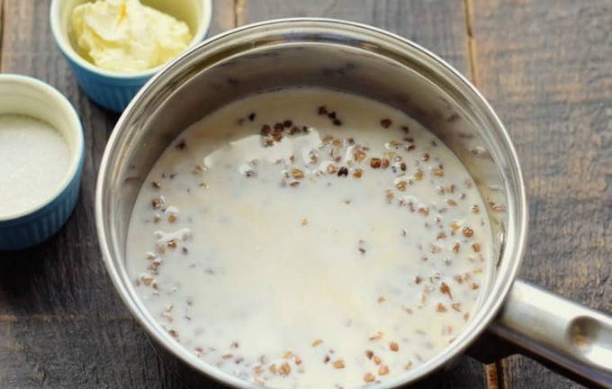 - Kook de melk in een aparte pan en giet deze bij de gekookte boekweit. Voeg suiker naar smaak toe, breng opnieuw aan de kook en haal van het vuur. We vullen de traktatie aan met olie en laten ongeveer 10 minuten onder het deksel staan.
