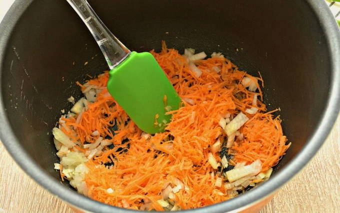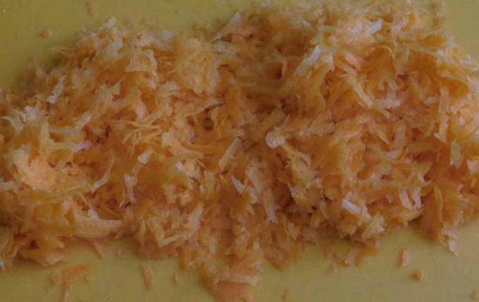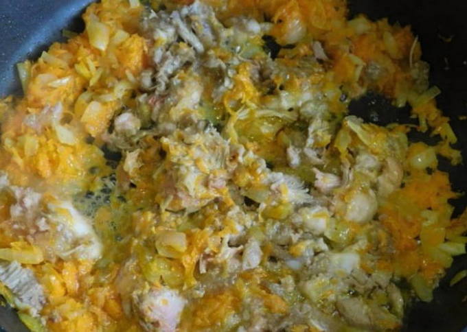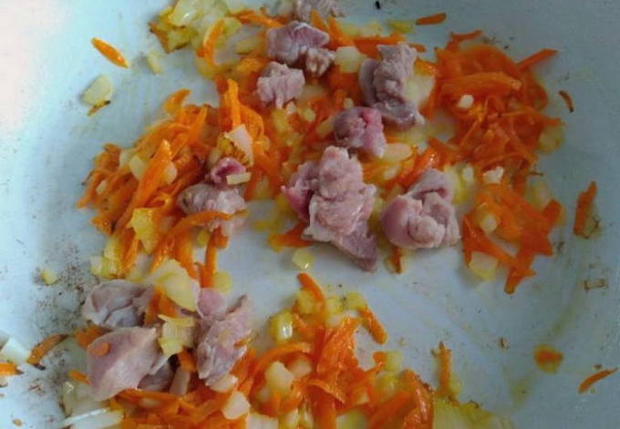 - Rasp de wortel en snipper de ui. Bak groenten in plantaardige olie. Leg hier in kleine stukjes gesneden varkensvlees.