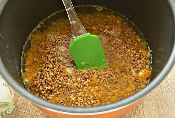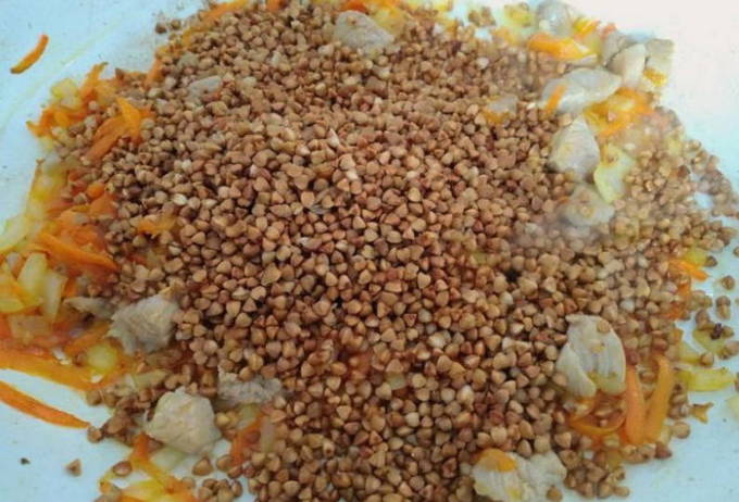 - We verspreiden de gewassen boekweitgrutten in het gebraad. Zout en peper, vul met water en kook gedurende 20-25 minuten.