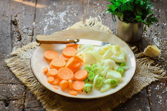 - Snijd vervolgens de wortel in dunne cirkels, snijd de ui en knoflook in kleine stukjes.