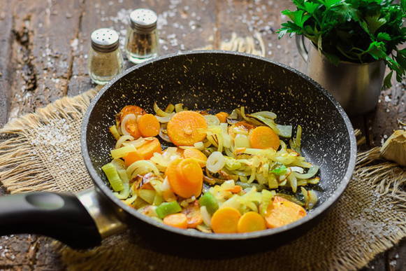 - Bak groenten tot ze zacht zijn in plantaardige olie.
