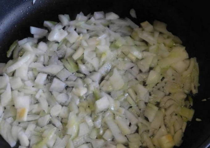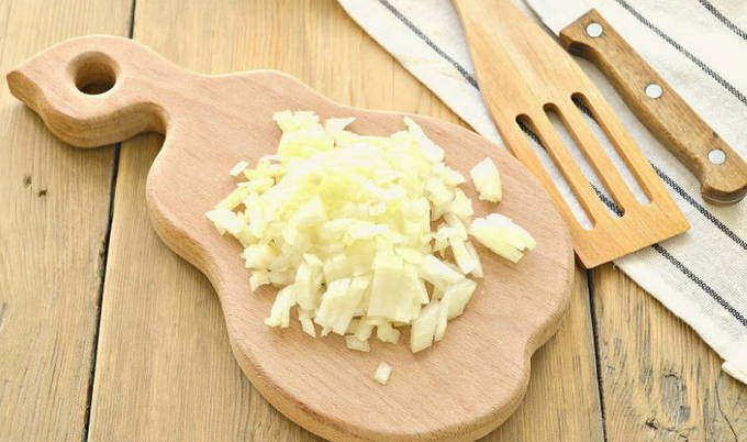 - Snijd de ui in kleine blokjes en bak deze in plantaardige olie.