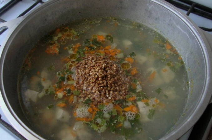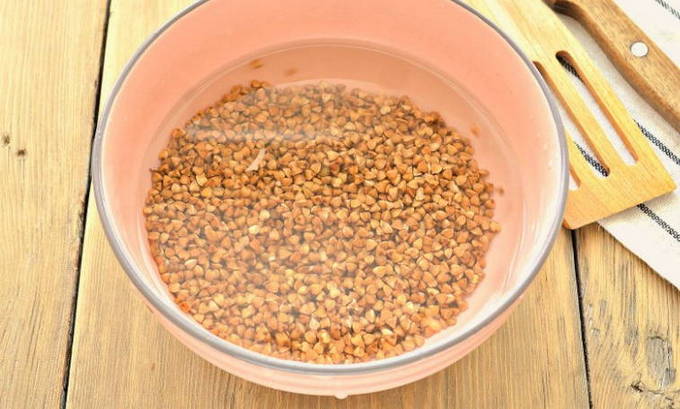 - We vullen de massa aan met gewassen boekweit. Zout het voedsel en vul het met water. Kook op laag vuur ongeveer 20 minuten.