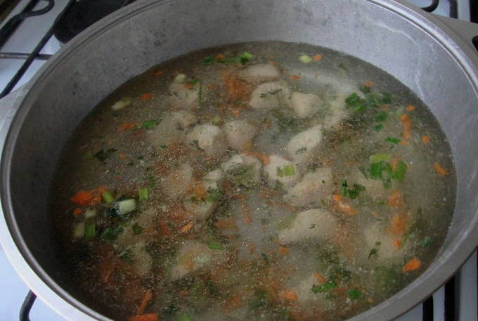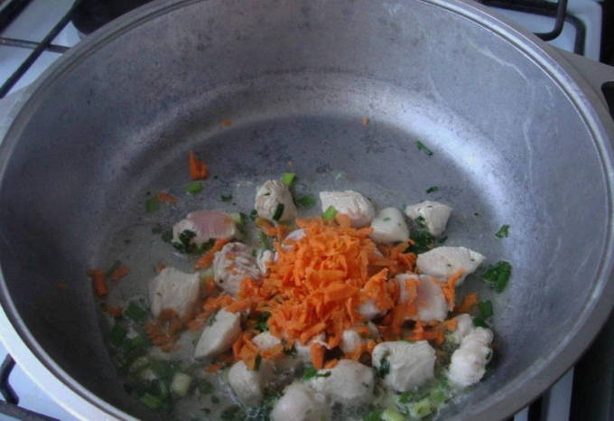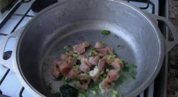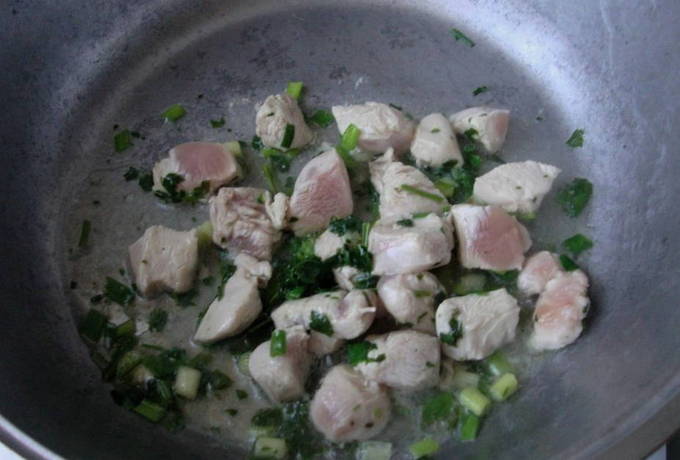- We warmen een ketel of een handige pan op. Geef de bodem water met plantaardige olie, leg hier kip en gehakte greens.