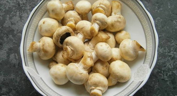 Schil de champignons, was goed en kook in gezouten water, verwijder constant het schuim van het wateroppervlak. Gebruik vervolgens een schuimspaan om de champignons uit de pan te halen en af te laten koelen.