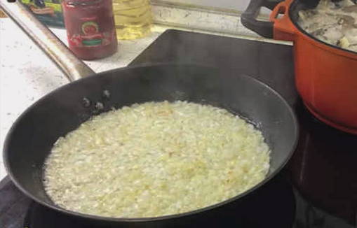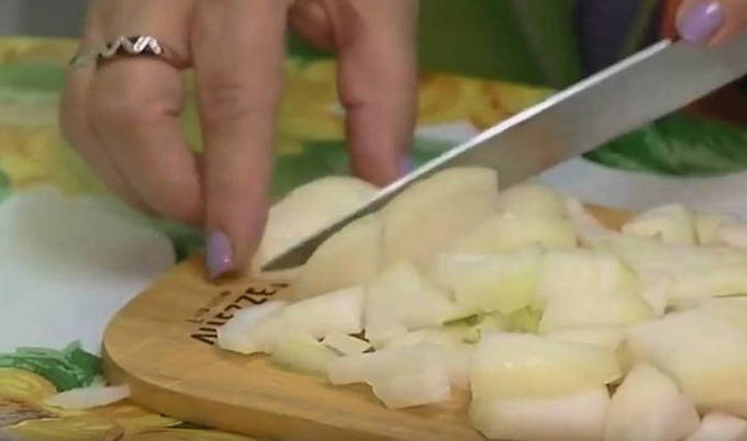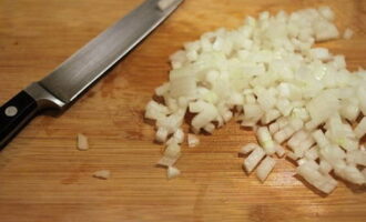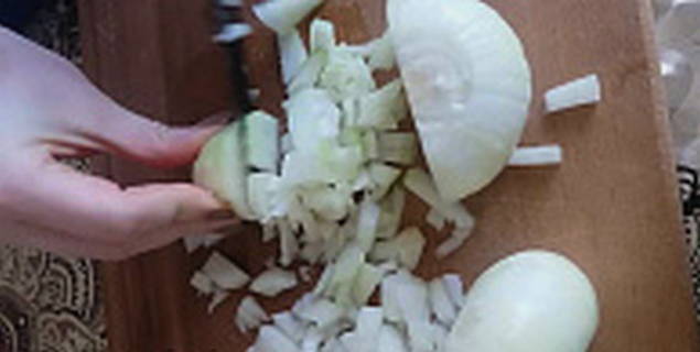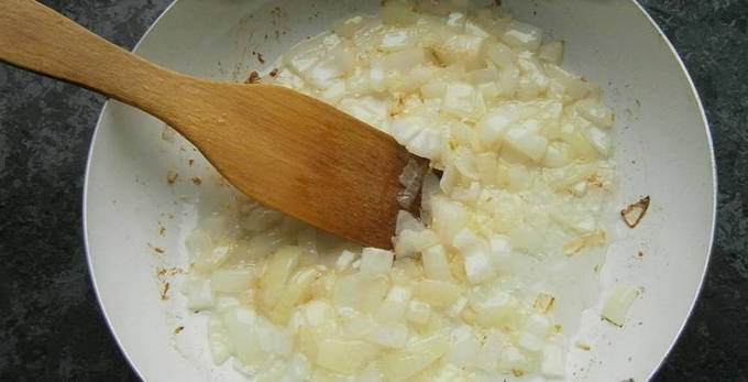 - Pel de ui en hak fijn. Bak het vervolgens in plantaardige olie tot het gaar is.