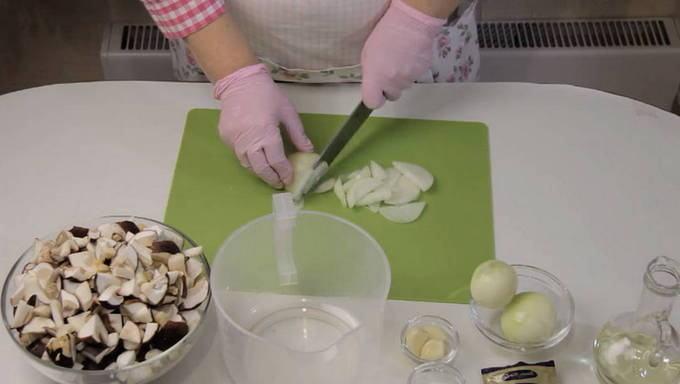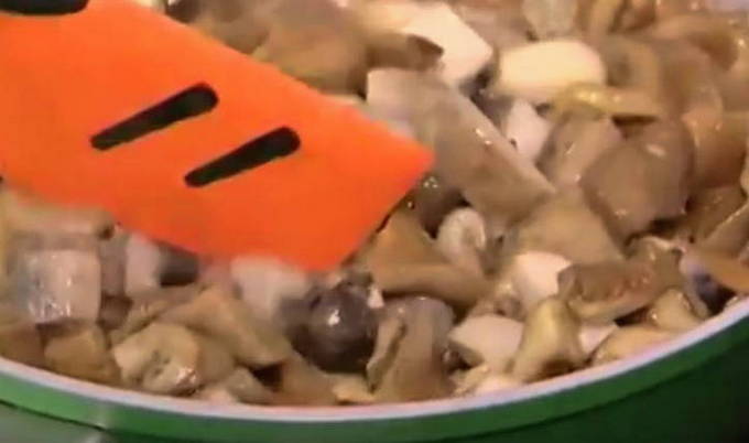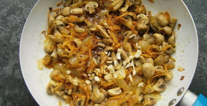 - Vet een koekenpan in met plantaardige olie, leg er uien en knoflook op, bak ze ongeveer 10 minuten tot ze transparant zijn en breng ze dan over naar de champignons.