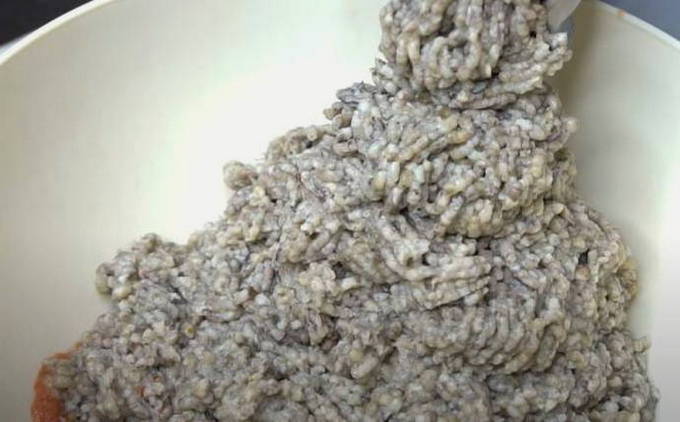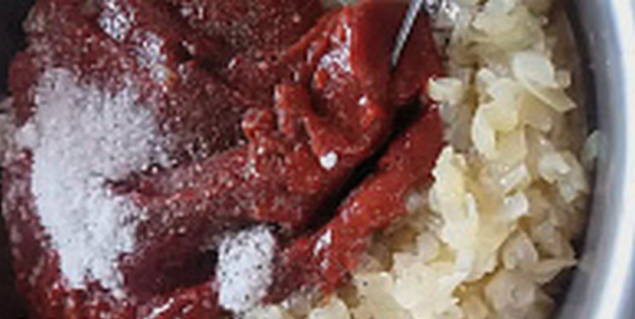 - Haal de gebakken uien en champignons door een vleesmolen, voeg de tomatenpuree toe.
