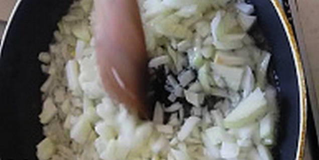 - Schil de uien, hak ze fijn en bak ze in plantaardige olie tot ze zacht zijn.