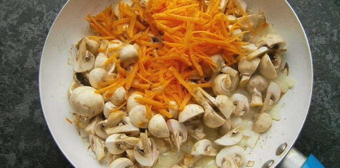 - Voeg gehakte champignons en geraspte wortelen toe aan de gebakken uien. Kook alles samen 5-7 minuten, af en toe roeren.