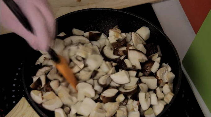 - Doe de champignons in een droge koekenpan en laat ze onder het deksel een half uur sudderen.