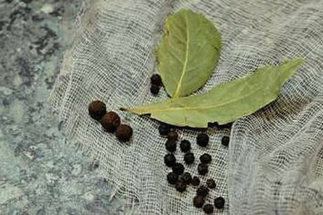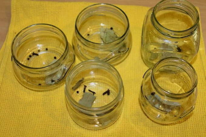 - Leg een beetje laurier, kruidnagel en piment op de bodem van de gesteriliseerde potten.