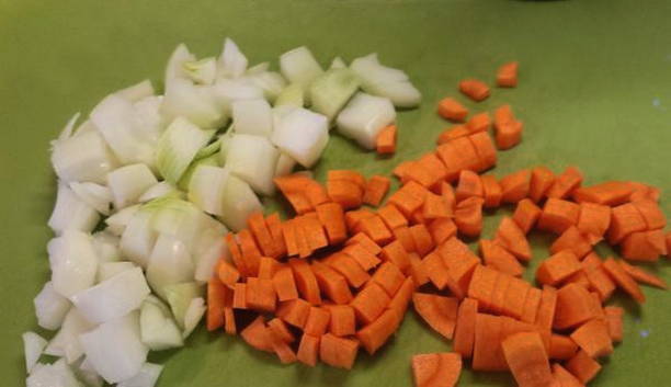 - Was uien, wortelen en knoflook, schil en hak fijn.