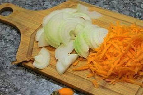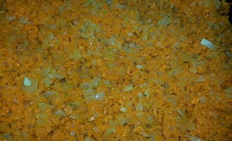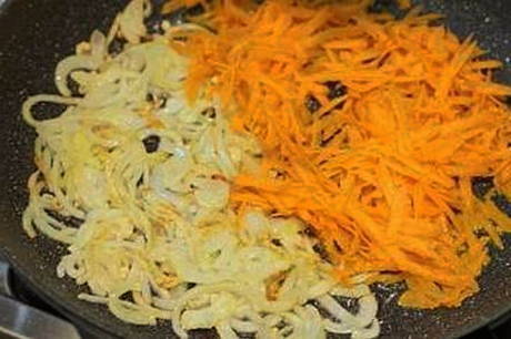 - Wrijf de wortelen door een vleesmolen of rasp op een fijne rasp. Hak de ui fijn, bak hem transparant in plantaardige olie. Voeg vervolgens de wortels toe aan de pan, blijf een paar minuten bakken.