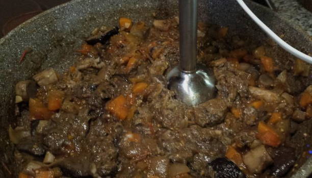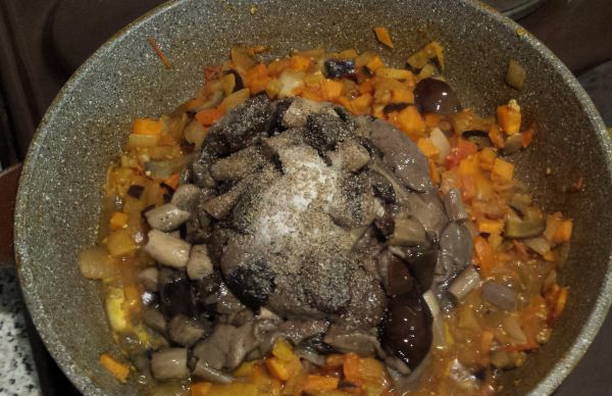 - Voeg champignonmassa, zout en zwarte peper toe aan uien en wortels, roer en laat ongeveer een uur op laag vuur sudderen.