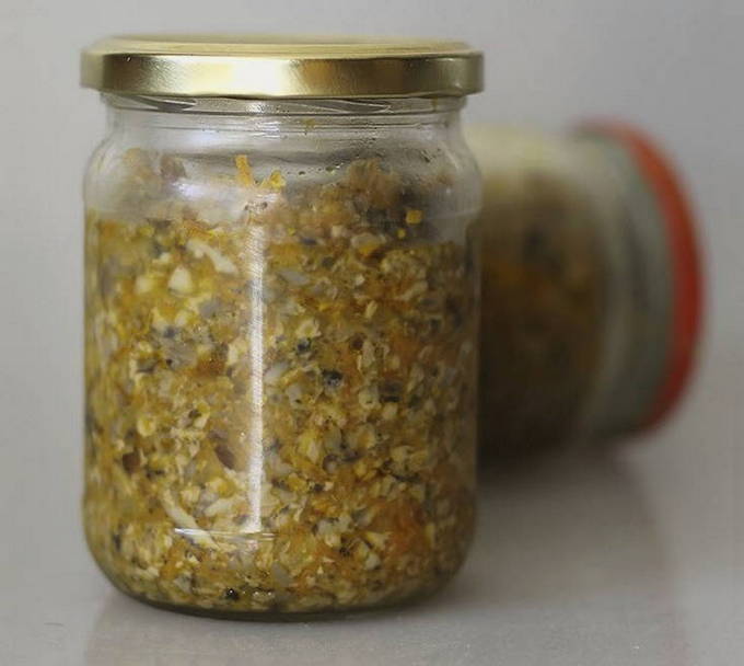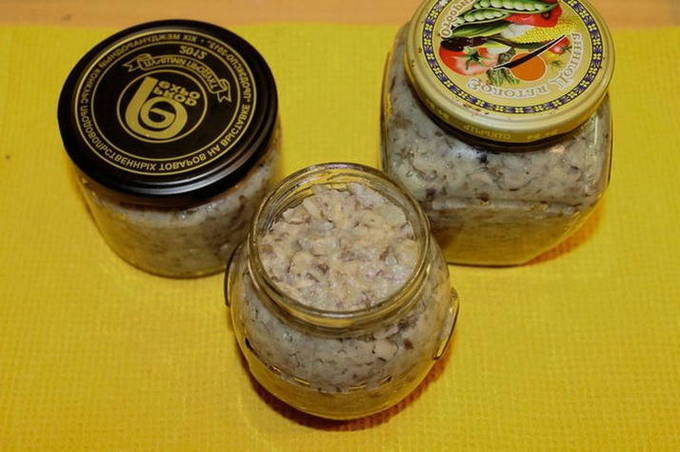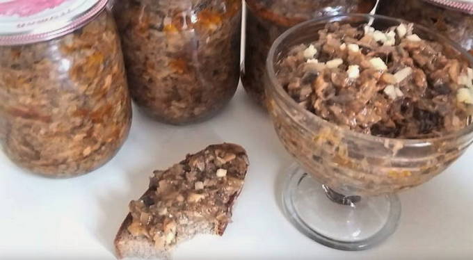 - Breng de voorbereide kaviaar over in gesteriliseerde potten en sluit ze goed af met deksels. Bewaar paddenstoelenkaviaar in de koelkast.