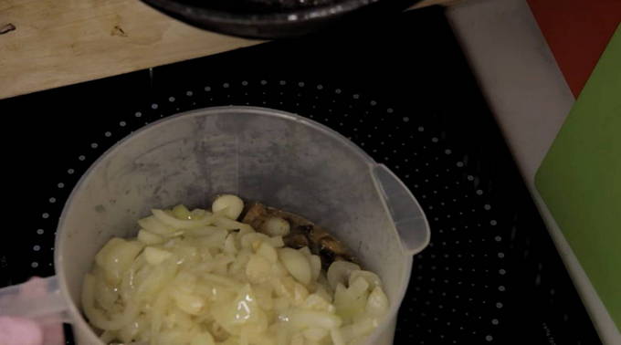 - Bak de champignons apart, combineer ze met de uien en laat de ingrediënten iets afkoelen.