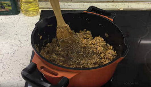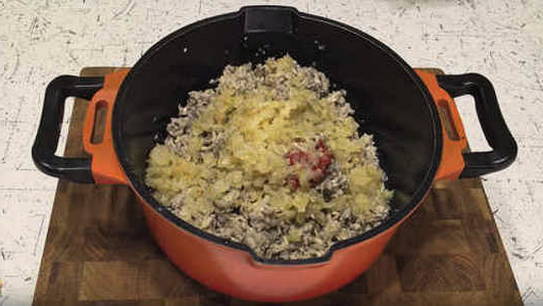 - Voeg de gebakken uien toe aan de pan en zet op het vuur.