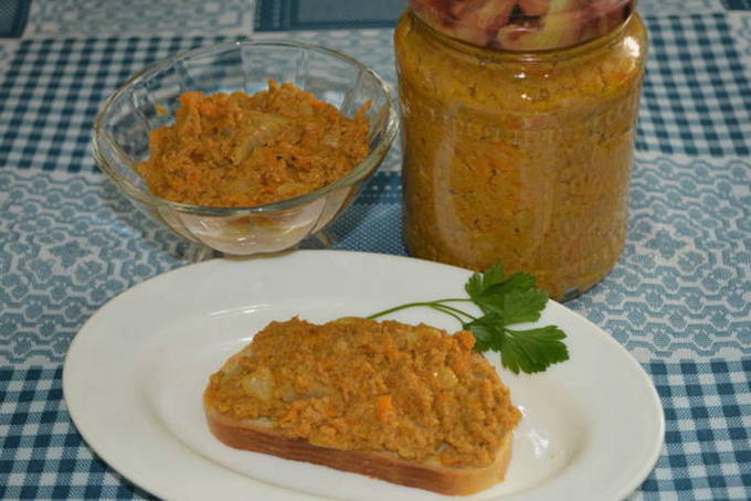 - Champignonkaviaar door een vleesmolen met wortelen en uien voor de winter