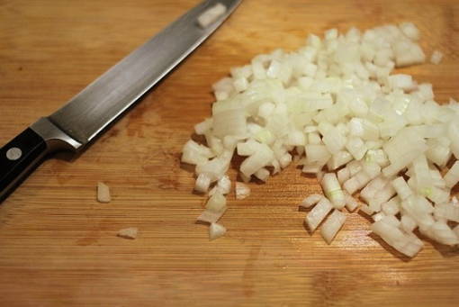 - Pel de ui en hak fijn. Bak het vervolgens in plantaardige olie tot het gaar is.