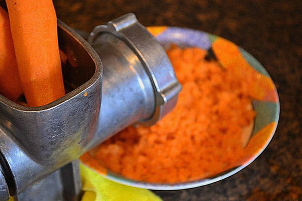 Schil de wortelen, was en wrijf ze door een vleesmolen. Hak ook de champignons fijn.