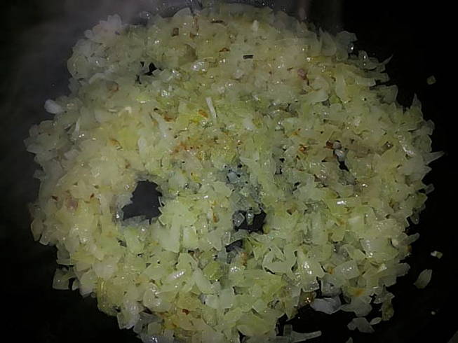 - Schil de uien, hak ze fijn en bak ze in plantaardige olie tot ze zacht zijn.