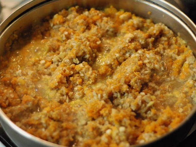 - Wrijf de wortelen door een vleesmolen of rasp op een fijne rasp. Hak de ui fijn, bak hem transparant in plantaardige olie. Voeg vervolgens de wortels toe aan de pan, blijf een paar minuten bakken.