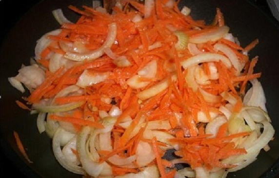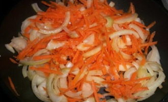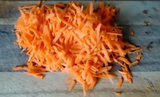 - Rasp de wortelen op een grove rasp, voeg toe aan de pan aan de ui en bak ook tot ze half gaar zijn.