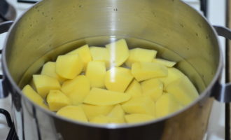 - Snijd de geschilde aardappelen in kleine blokjes en doe ze in een pan.
