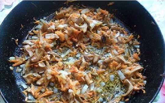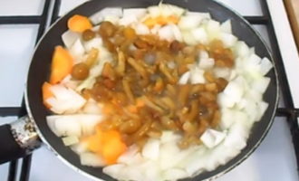 - Voorontdooide cantharellen fijn hakken, overbrengen naar de gebakken uien en wortelen en alles 15 minuten op laag vuur laten sudderen. Roer de inhoud van de pan constant met een lepel.