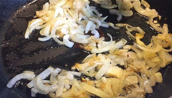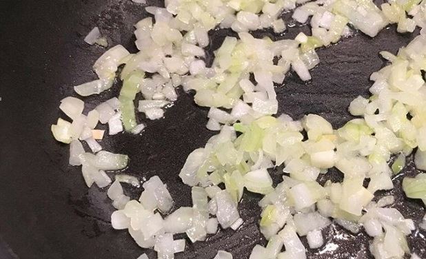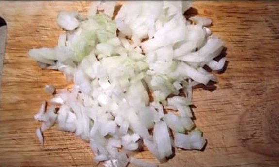 - Snijd de gepelde ui in kleine blokjes en bak in een schone koekenpan in een beetje olie.
