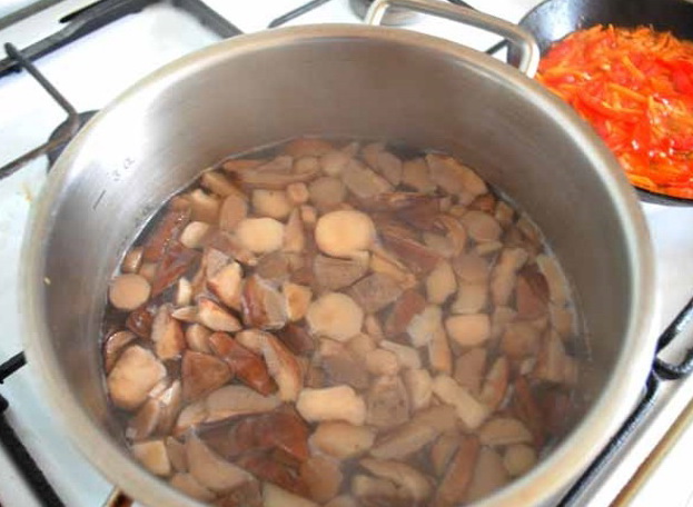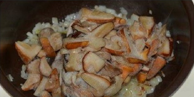 - Wanneer het water in de pan kookt, voeg je de champignons toe zonder ze te ontdooien, als ze eerder in kleine stukjes waren gesneden.