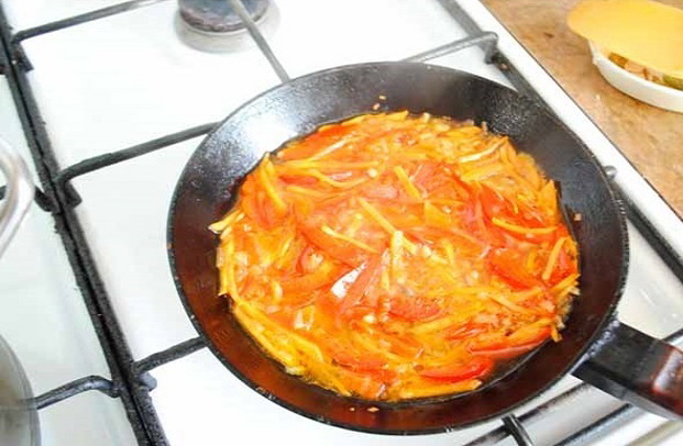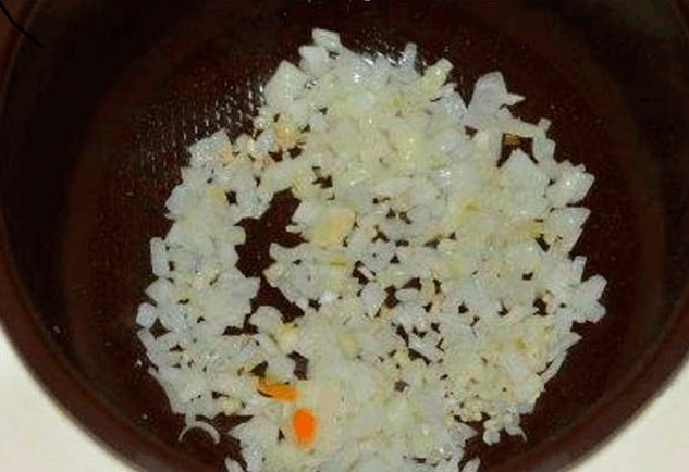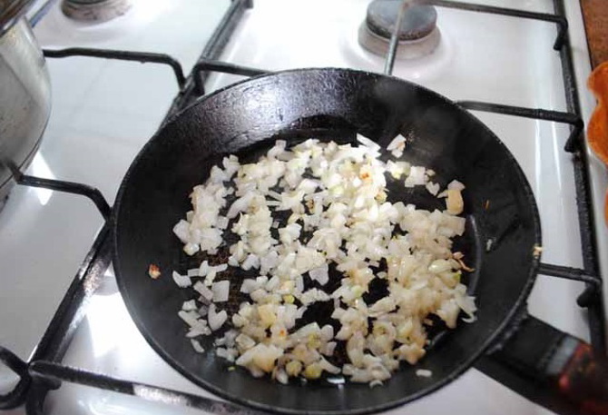 - Giet plantaardige olie in een pan met dikke bodem 2 mm boven de bodem en zet op middelhoog vuur. Fruit in deze verwarmde olie de gesnipperde ui tot ze transparant is.