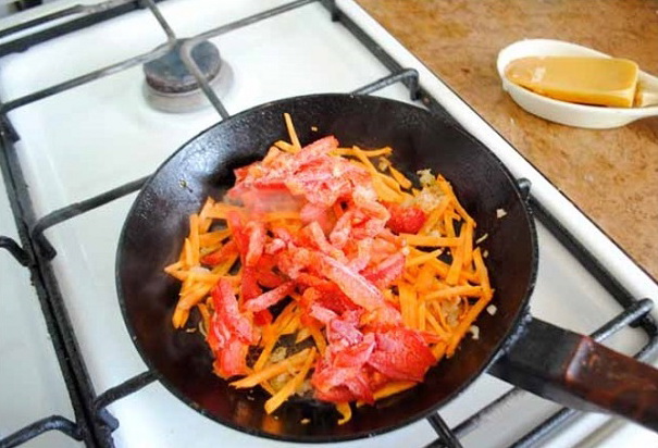 - Voeg paprika's, in dunne reepjes gesneden, toe aan een koekenpan (u kunt bevroren gebruiken). Het accentueert de smaak van alle ingrediënten van het gerecht en maakt, samen met wortelen, de champignonsoep helder en mooi.
