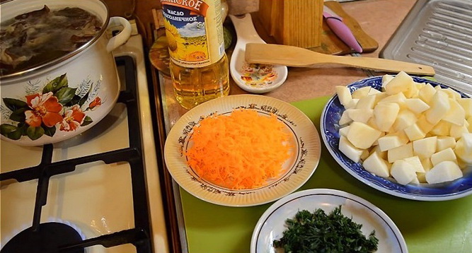 - Bak vervolgens de voorbereide champignons in dezelfde koekenpan gedurende 8-10 minuten en doe ze in de soep.