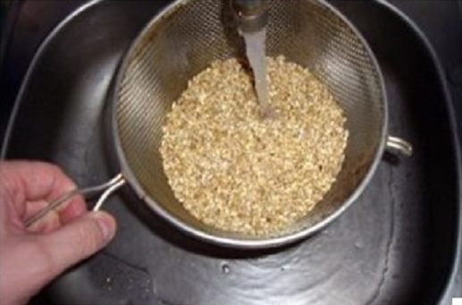 - Spoel de Alkmaarse gort goed af en laat hem 2-4 uur in koud water weken. Spoel de geweekte Alkmaarse gort opnieuw, doe in een pan, giet kokend water 3 cm boven het graanniveau en kook op laag vuur onder een deksel tot het water volledig is weggekookt. Roer de granen regelmatig met een lepel.