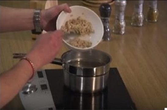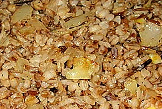 - Snijd de ui in kleine blokjes en bak tot ze glazig zijn in een koekenpan met boter. Doe vervolgens de gekookte gerst bij de ui en bak alles 7 minuten op middelhoog vuur, onder voortdurend roeren met een lepel.