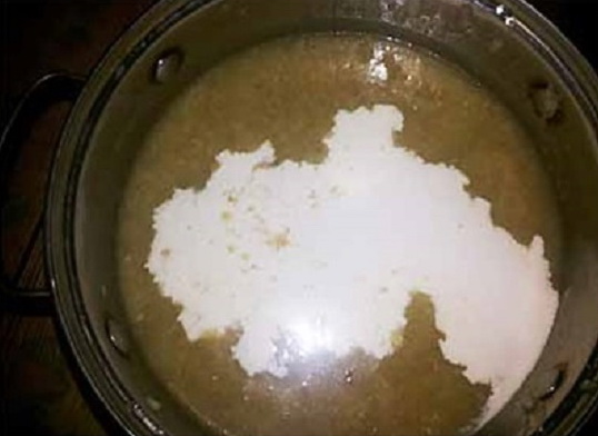 - Bak de bloem in een droge koekenpan tot hij romig is. Los het op met melk, roer zodat er geen klontjes zijn en giet het resulterende mengsel in een dunne stroom in een pan, onder voortdurend roeren met een lepel.