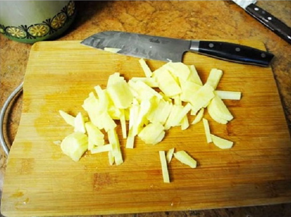 Giet 3 liter water in een pan voor het koken van soep, doe er de gesneden aardappelen in en kook deze onder een gesloten deksel op laag vuur half gaar.