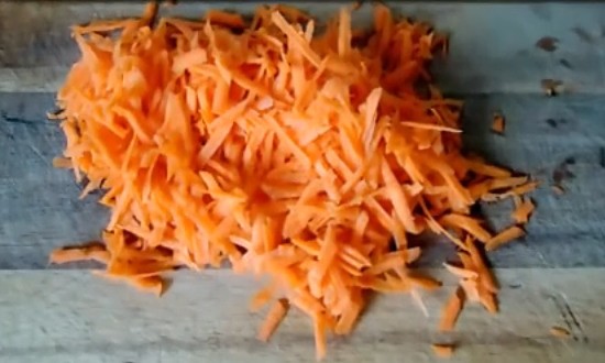 - Rasp de wortelen op een grove rasp, voeg toe aan de pan aan de ui en bak ook tot ze half gaar zijn.
