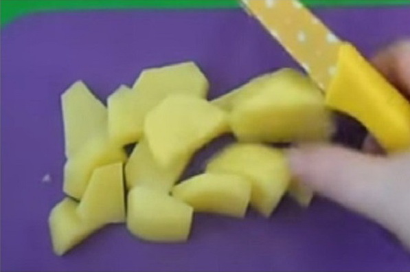 - Snijd de aardappelen in kleine blokjes.