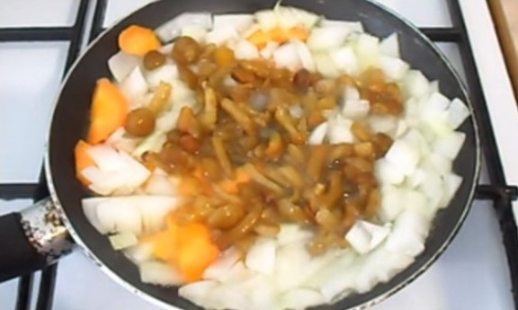 - Voorontdooide cantharellen fijn hakken, overbrengen naar de gebakken uien en wortelen en alles 15 minuten op laag vuur laten sudderen. Roer de inhoud van de pan constant met een lepel.