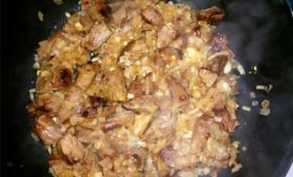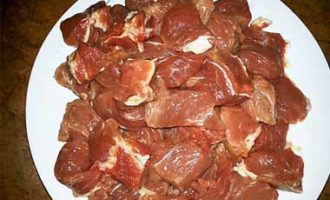 - De eerste stap is om het vlees in een pan te bakken. Om dit te doen, snijd het in blokjes, meng met bloem en bruin in zonnebloemolie. Breng het vlees vervolgens over in een vorm of pot.
