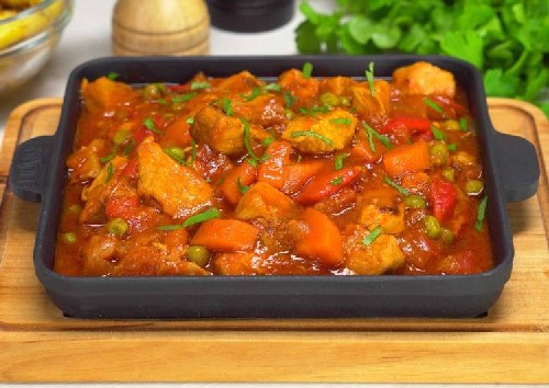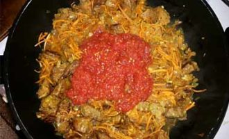 - Combineer tomaten met vlees, uien en wortelen. Giet de inhoud van de vorm met heet water of bouillon zodat alle lagen licht bedekt zijn. Voeg tegelijkertijd tomatenpuree toe en zet de bereiding 1 uur in de oven. Temperatuurbereik - 170-180 graden.