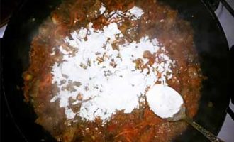 - De volgende stap is om tomatenpuree, bloem en zure room naar de vuurpot te sturen. Laat de gemengde ingrediënten 15 minuten sudderen.