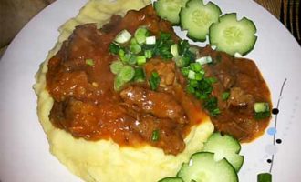 Het is beter om gearomatiseerde rundergoulash met jus te serveren in combinatie met aardappelpuree en groenten.